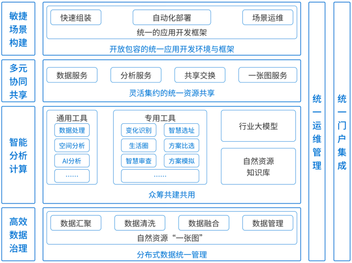 《總體方案》中針對國土空間基礎(chǔ)信息平臺(以下簡稱“平臺”)存在的“平臺統(tǒng)一匯聚和數(shù)據(jù)管理能力不夠、應(yīng)用支撐能力不強、智能化水平不高”等問題,提出要通過完善統(tǒng)一管理與分布式運行體系、推動平臺“數(shù)智化”升級、提高協(xié)同共享能力、構(gòu)建開放數(shù)字生態(tài)體系等,服務(wù)自然資源“一張圖”數(shù)據(jù)統(tǒng)一管理、資源開放共享與多維數(shù)字化應(yīng)用場景構(gòu)建。
